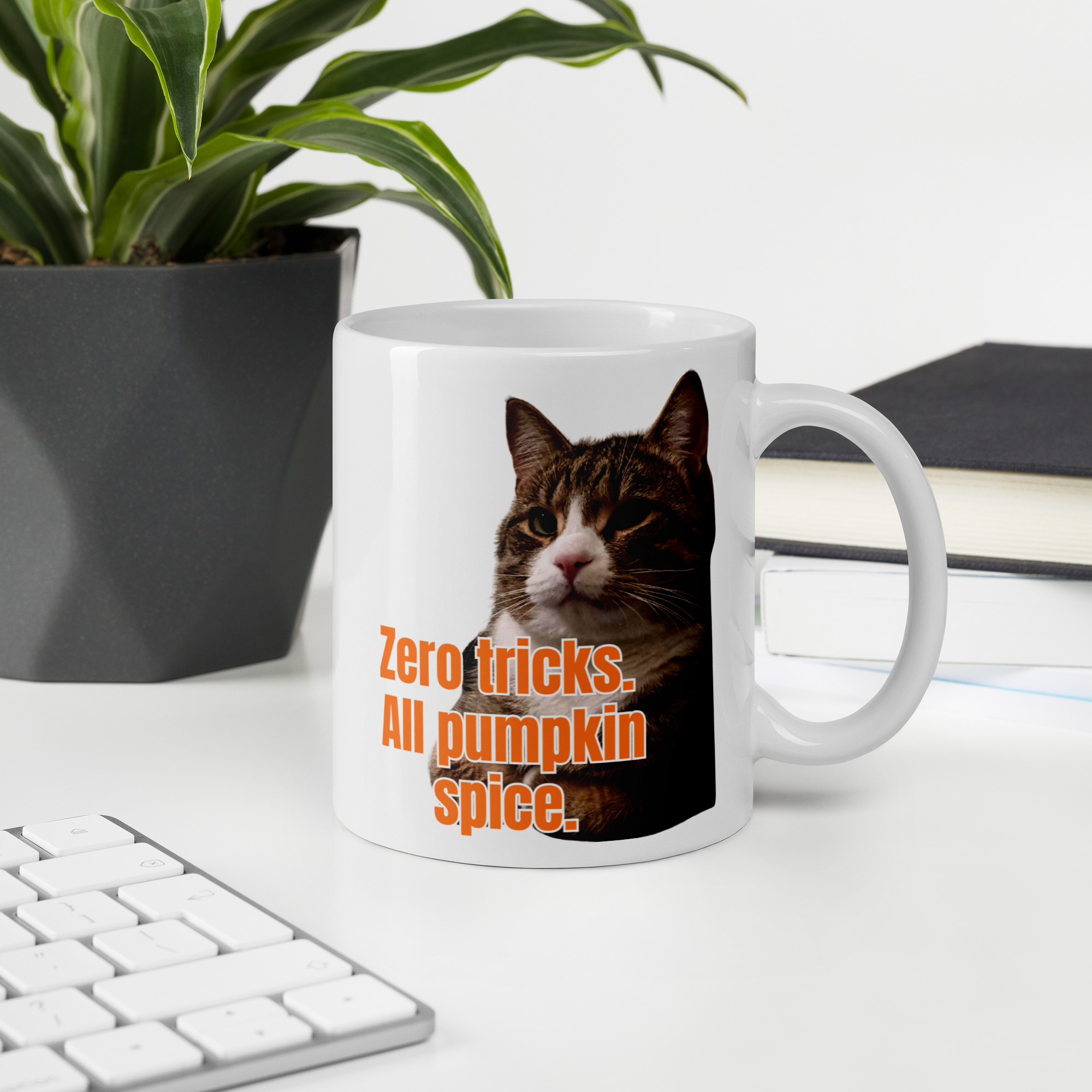 Celebrate autumn with a mug that’s as witty and cosy as the season itself. On one side, bold “Trick or Treat” lettering is clawed through with playful cat scratches — a reminder that when cats are around, there’s always a little mischief in the air. On the other side, a charming tabby cat takes the spotlight with the cheeky slogan: “Zero tricks. All pumpkin spice.”